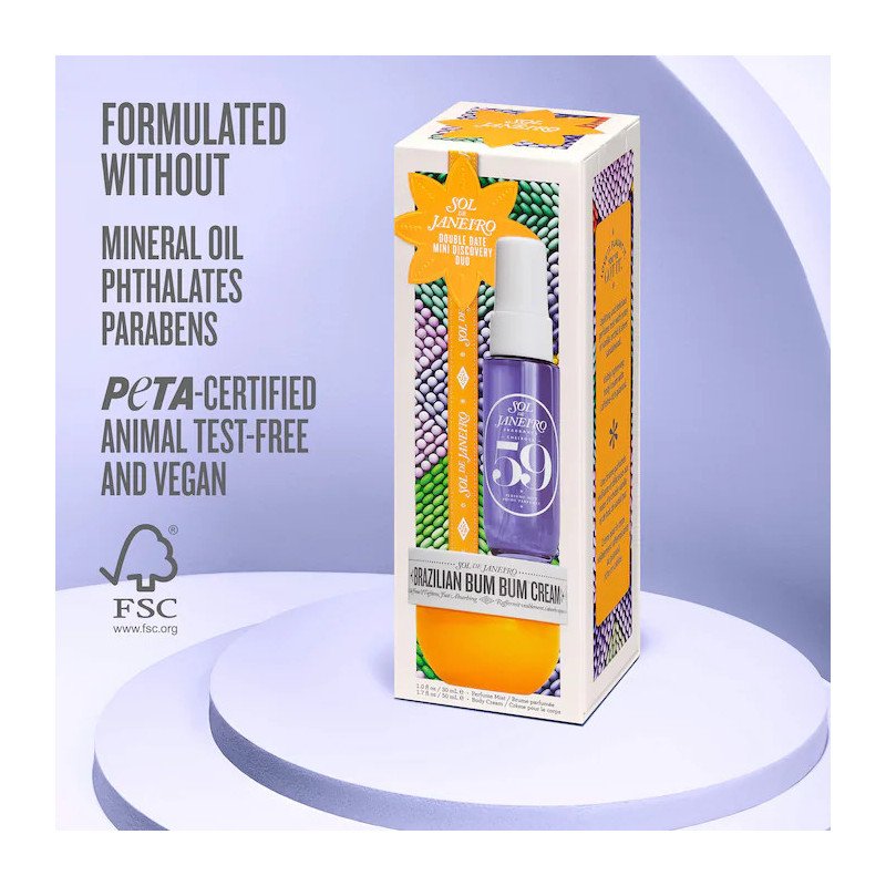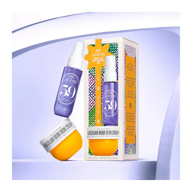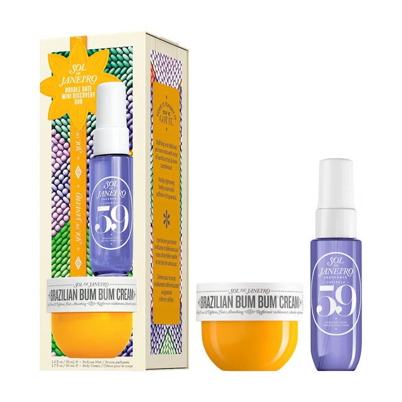 Le coffret Double Date Mini Discovery Duo de Sol de Janeiro réunit deux icônes de la marque en format découverte : la célèbre Brazilian Bum Bum Cream et la brume parfumée Cheirosa 59. Ensemble, ils composent un rituel corps hydratant et “uplifting” qui lisse la peau tout en la parfumant d’un sillage chaud, gourmand et boisé.