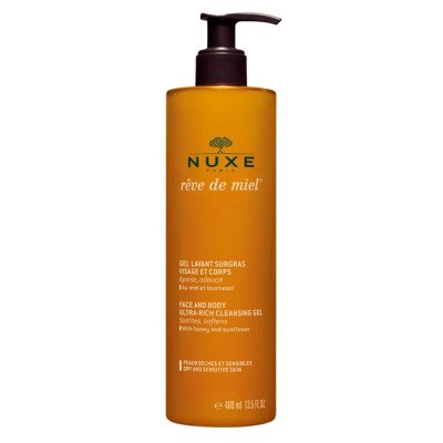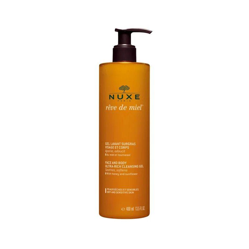 Le Gel Lavant Surgras Visage & Corps 400 ml de Nuxe combine douceur, efficacité et sensorialité. Enrichi en miel, en propolis et en huiles d’amande douce, il nettoie en profondeur tout en respectant le film hydrolipidique de la peau. Sa mousse onctueuse élimine impuretés, pollution et traces de maquillage sans agresser, laissant la peau confortable, douce et protégée.